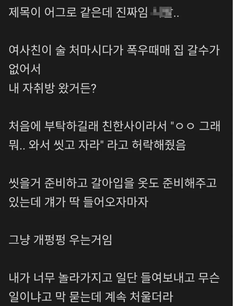 글쓴이는 “여사친이 술 마시다 폭우 때문에 집에 갈 수 없어서 내 자취방에 왔다. 친한 사이라서 ‘와서 씻고 자라’라고 허락해줬다”고 운을 뗐다.