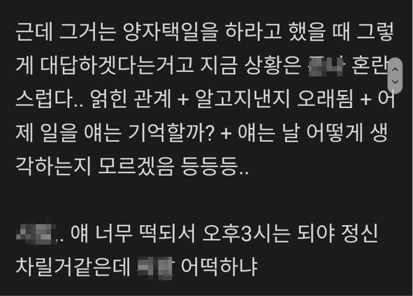 여사친 반응도 뭔가 이상하다고 글쓴이는 말했다. 간밤의 일을 기억하지 못하는지 해장 타령만 하고 있다는 것. 그래도 글쓴이는 여사친이 싫진 않은 모양이다. 그는 누군가 사귈 거냐고 묻는다면 사귈 것 같다고 말했다. 다만 그는 여사친이 친구의 전 여자친구라는 점, 알고 지낸 지가 오래됐다는 점, 간밤의 일을 기억하고 있는지 모르겠다는 점, 자신을 어떻게 생각하는지 모른다는 점 등으로 인해 혼란스럽다고 했다.