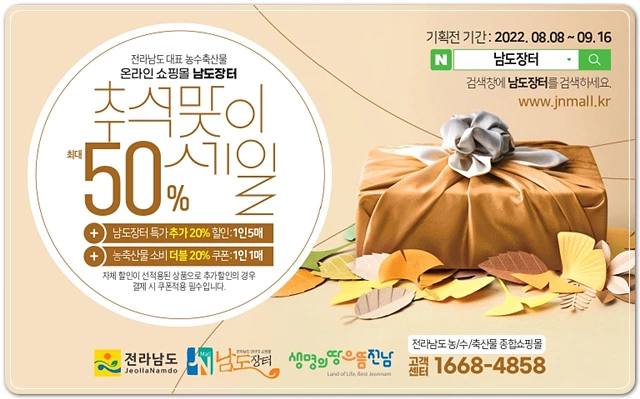 전남도(도지사 김영록)는 농·수·축산물 소비 촉진을 통한 농어가 소득증대 및 지역경제 활성화를 위해 남도장터에서 9월 16일까지 ‘솔찬한 상상추(秋)월’ 기획전을 마련하고 추석 준비 할인 행사에 들어갔다.