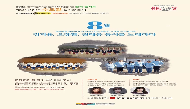 (충북=위키트리) 김성호 기자 = 충북도와 충북문화재단은 오는 31일 저녁 7시 충북문화관 야외정원에서 숲속콘서트 ‘단양에서 영동까지 스토리가 있는 충북의 노래 두 번째 마당 - 정지용, 오장환, 권태응 동시를 노래하다’를 개최한다.