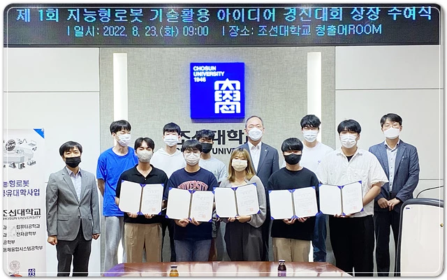 지난 23일 조선대학교 본관 청출어룸에서 진행된 시상식에는 최종 선정된 5개 팀, 민영돈 총장, 김태규 지능형로봇혁신공유대학사업단장, 이성준 지능형로봇혁신공유대학사업부단장, 고가진 교수 등 총 14명이 참석한 가운데 진행됐다.