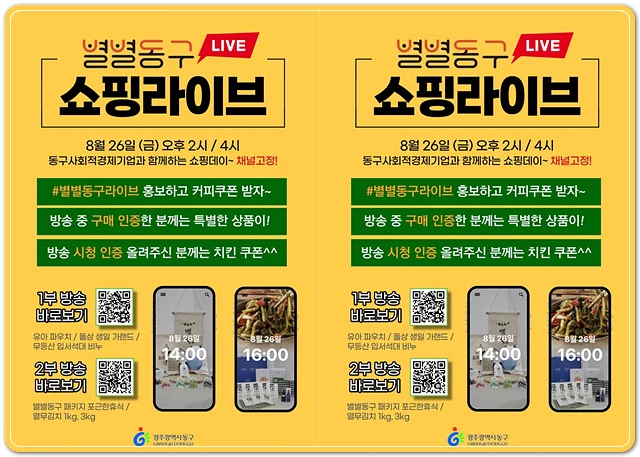 ‘별별동구 라이브커머스’는 네이버 쇼핑라이브 채널을 통해 오는 26일 오후 2시, 4시 두 차례에 걸쳐 진행되고, 네이버 쇼핑라이브에서 ‘별별동구’를 검색 후 시청할 수 있다.