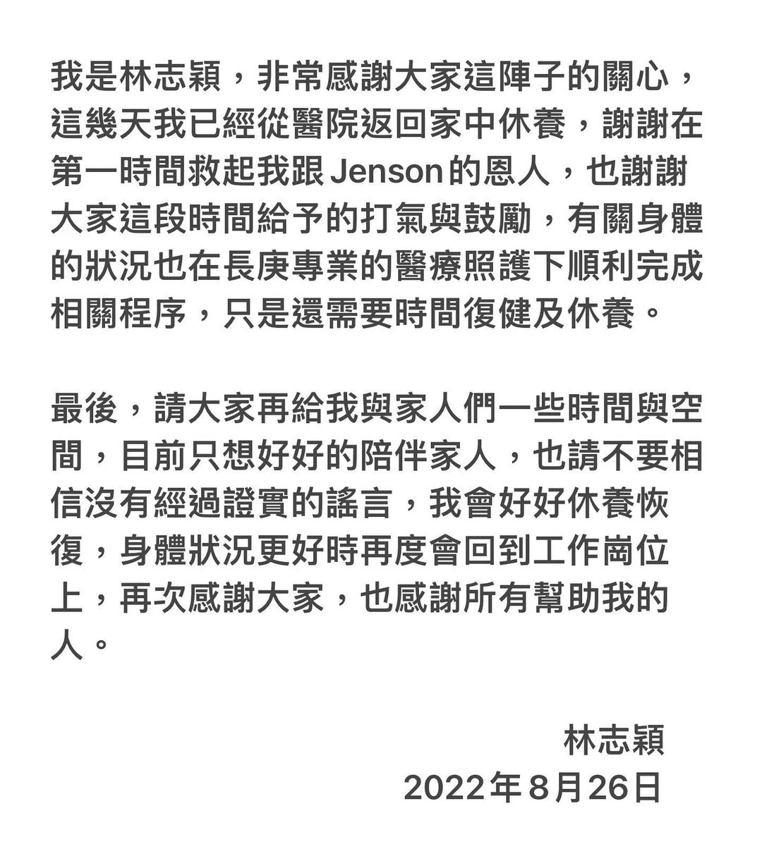 이에 임지령은 "저는 임지령입니다"로 시작하는 글로 직접 해명에 나섰다. 그는 많은 관심에 감사하고, 현재는 이미 병원에서 퇴원한 뒤 집에서 쉬고 있다고 밝혔다. 사고 당시 아들 젠슨(Jenson)을 구해준 은인에게 고맙고, 몸 상태도 많이 좋아졌다고 전하기도 했다.