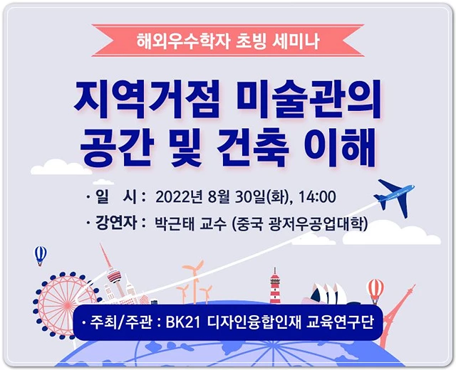 이번 세미나는 중국 광저우공업대학의 박근태 교수를 초청해 ‘지역거점 미술관의 공간 및 건축 이해’ 라는 주제로 진행되는데, 박물관 및 미술관 디자인 관련 공간 구성과 최근의 건축 경향을 중심으로 공간을 이해하는 기본 요소, 박물관·미술관 공간 기획 및 조성, 박물관·미술관 건축 등 다채로운 정보가 제공된다,