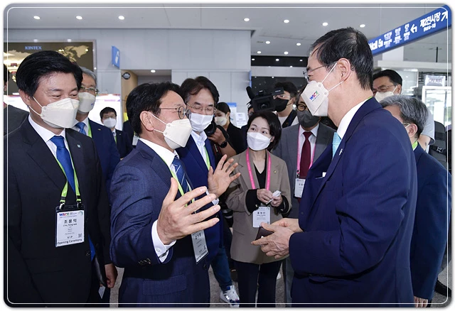 강기정 광주광역시장이 31일 오전 경기도 고양 킨텍스에서 열린 '2022 월드 스마트시티 엑스포' 개막식에 참석해 한덕수 국무총리와 인사를 하고 있다./광주광역시 제공