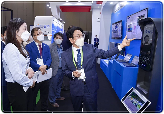 강기정 광주광역시장이 31일 오전 경기도 고양 킨텍스에서 열린 '2022 월드 스마트시티 엑스포' 개막식에 참석해 광주시 스마트시티 전시관을 살펴보고 있다./광주광역시 제공