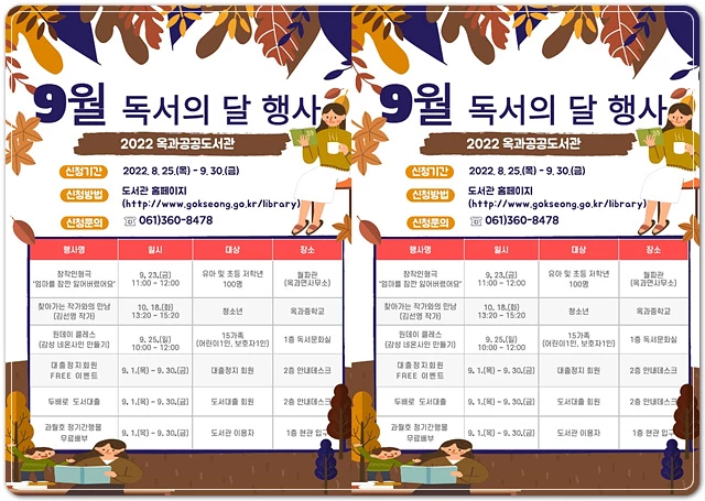 모든 프로그램의 참가비는 무료이며, 신청은 옥과공공도서관 홈페이지를 통해 가능하다. 기타 자세한 사항은 옥과공공도서관(☎360-8478)으로 문의하면 된다. 군 관계자는 “독서하기 좋은 계절에 도서관에서 책도 읽고 다양한 프로그램에도 참여해 마음이 풍성해지는 9월을 보내시길 바란다.”라고 말했다.
