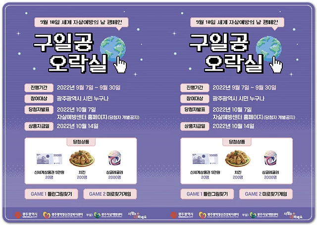 ‘구일공 오락실’을 주제로 진행되는 이번 캠페인은 세계 자살예방의 날과 광주시 자살예방 지원사업을 홍보하기 위해 마련됐다.