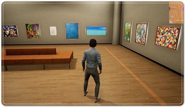 메타버스의 개념인 아바타를 통하여 현장에서 직접 보는 듯이 자기가 보고 싶은 전시종류나 미술관을 찾아다닐 수 있고, 생생한 생동감으로 현장에서는 느낄 수 없는 작품의 확대 및 자세한 작품 설명도 직접 체크하여 바로 감상 할 수 있다.
