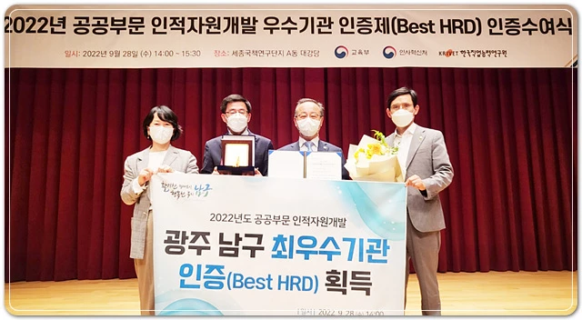 광주시 남구는 최근 세종국책연구단지에서 열린 ‘2022년 공공부문 인적자원개발 우수기관 인증제 평가’에서 최우수 기관에 선정됐다. 이정식 부구청장과 남구청 자치행정과 공직자들이 인증서와 인증패를 들고 기념촬영을 하고 있다.