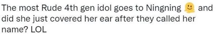 이에 한 네티즌은 트위터에 닝닝이 귀를 막은 행동에 대해 '무례하다'는 취지의 글을 남겼다. 팬들의 환호를 무시했다는 이유에서다.