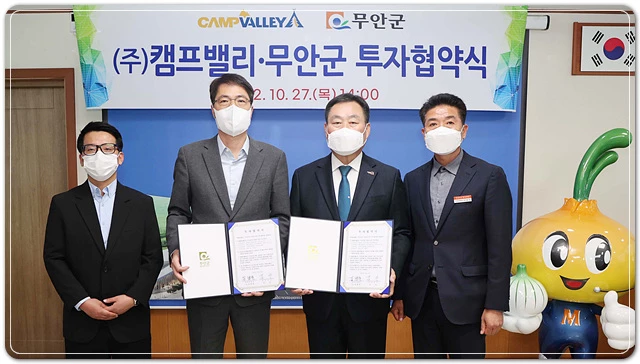 무안군은 27일 군청에서 김산 무안군수, ㈜캠프밸리 김범준 대표가 참석한 가운데 무안군 몽탄면 사천리 일원에 복합 물류단지 조성을 위한 540억원 규모의 투자협약을 체결했다.