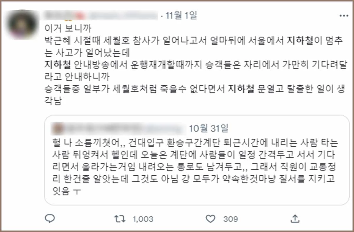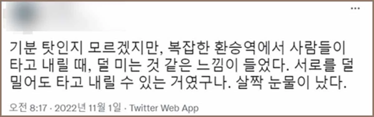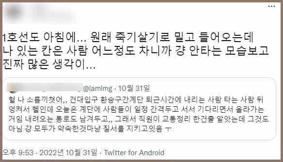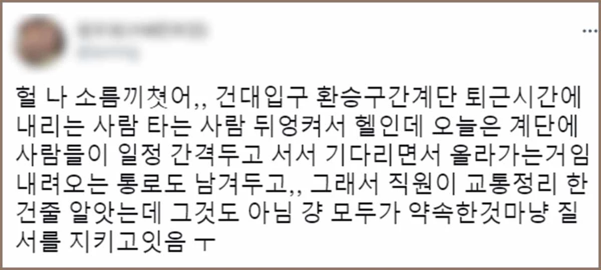 트위터 이용자 A씨는 이태원 참사가 발생한 지 이틀 뒤인 지난달 31일 트위터에 “헐 나 소름 끼쳤어, 건대입구역 환승 구간 계단은 퇴근 시간에 내리는 사람, 타는 사람 뒤엉켜서 ‘헬’인데 오늘은 사람들이 일정 간격을 두고 서서 기다리면서 올라가는 거야. 내려오는 통로도 남겨두고… 그래서 직원이 교통정리한 건 줄 알았는데 그게 아니었어. 그냥 모두가 약속한 것처럼 질서를 지키고 있더라”란 글을 올렸다.