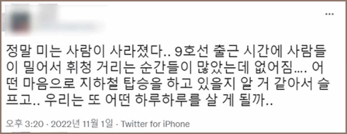 트위터 이용자 B씨는 1일 “정말 미는 사람이 사라졌다. 9호선 출근 시간에 사람들이 밀어서 휘청대는 순간이 많았는데 없어졌다. 어떤 마음으로 지하철 탑승을 하고 있을지 알 것 같아서 슬프다. 우리는 또 어떤 하루하루를 살게 될까”란 트윗을 올렸다.