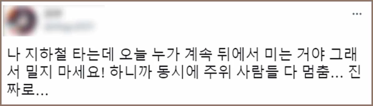 트위터 이용자 D씨는 1일 "지하철 타는데 오늘 누가 계속 뒤에서 미는 거야. 그래서 '밀지 마세요!' 하니까 진짜로 동시에 주위 사람들 다 멈췄어"라는 트윗을 올렸다.