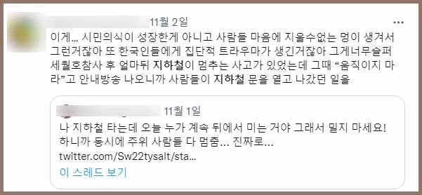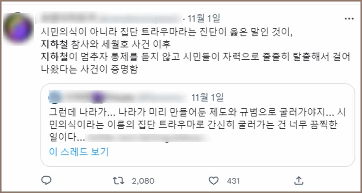 이 트윗을 읽은 트위터 이용자 E씨는 "시민의식이 성장한 게 아니고 사람들 마음에 지울 수 없는 멍이 생겨서 그런 거잖아. 또 한국인들에게 집단적 트라우마가 생긴 거잖아. 그게 너무 슬퍼. 세월호 참사 후 얼마 뒤 지하철이 멈추는 사고가 있었는데 그때 '움직이지 마라'라고 안내방송 나오니까 사람들이 지하철 문을 열고 나간 적이 있어"란 글을 올렸다.