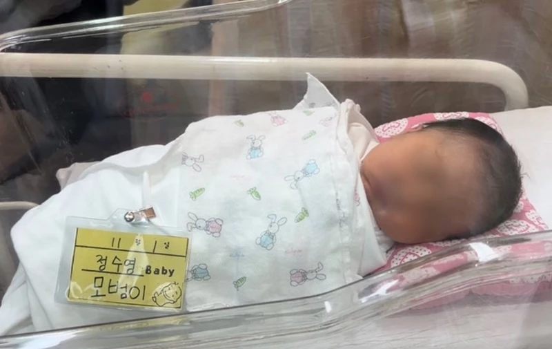 공개된 사진에는 곤히 잠들어 있는 공혁준-산범 커플의 아이를 볼 수 있다. 지난 1일 태어난 것으로 보이며 명찰 적혀 있는 태명 '모범이'도 눈길을 끈다.