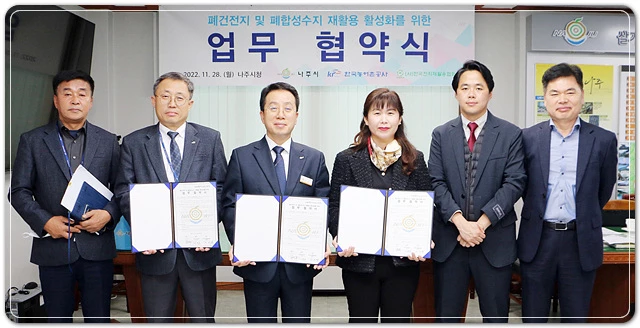 전라남도 나주시(시장 윤병태)는 지난 28일 한국농어촌공사, (사)한국전지재활용협회와 ‘폐건전지 및 폐합성수지 재활용 활성화’를 위한 업무협약을 체결했다고 29일 밝혔다.