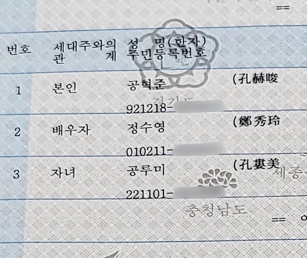 등본에는 '본인 공혁준, 배우자 정수영, 자녀 공루미'라고 적혀있다.