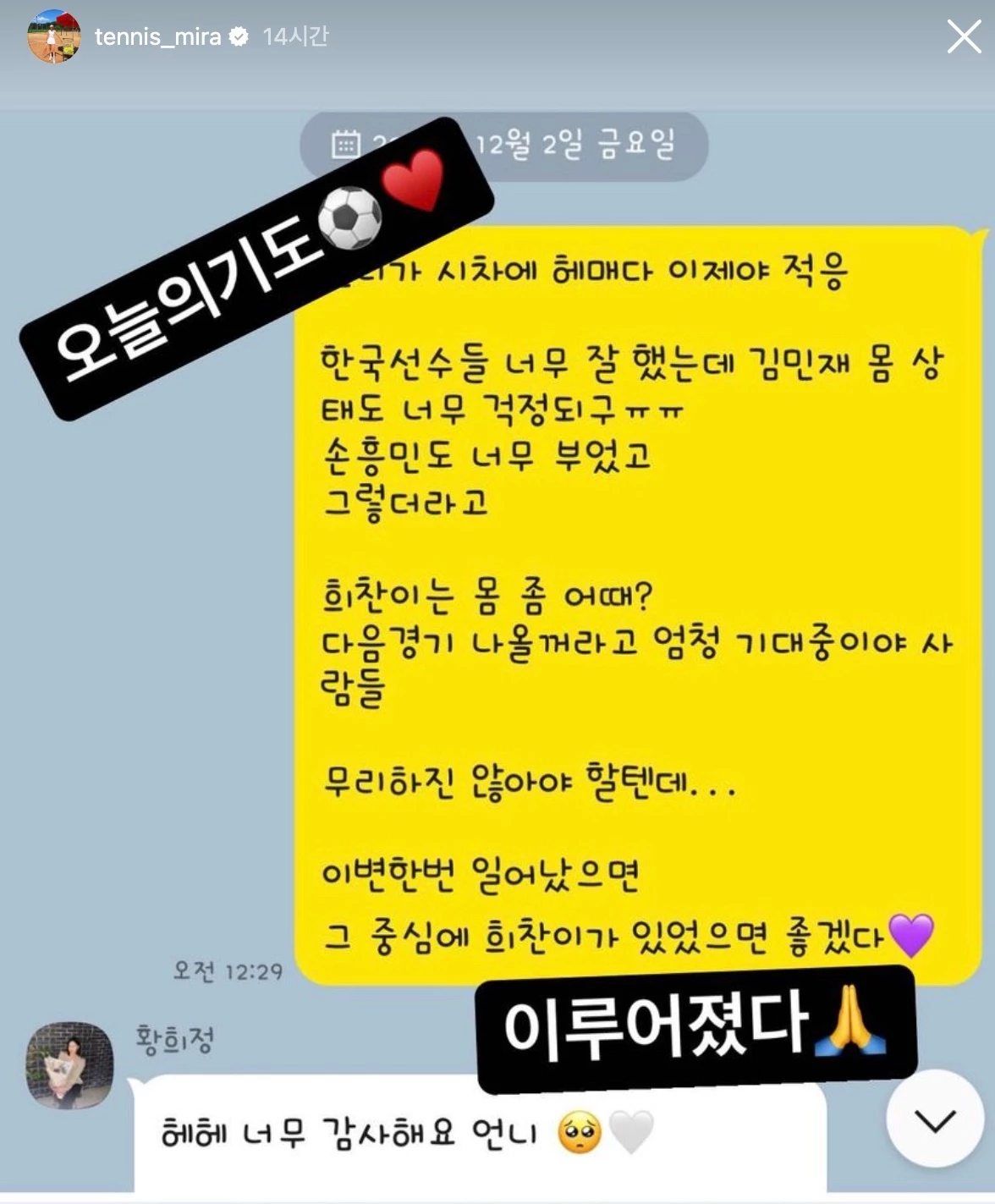 황희찬의 누나에게 선수들의 몸 상태를 걱정하면서 "이변 한 번 일어났으면, 그 중심에 희찬이가 있었으면 좋겠다"라고 응원했다. 누나 황희정 씨는 "너무 감사해요 언니"라고 화답했다.