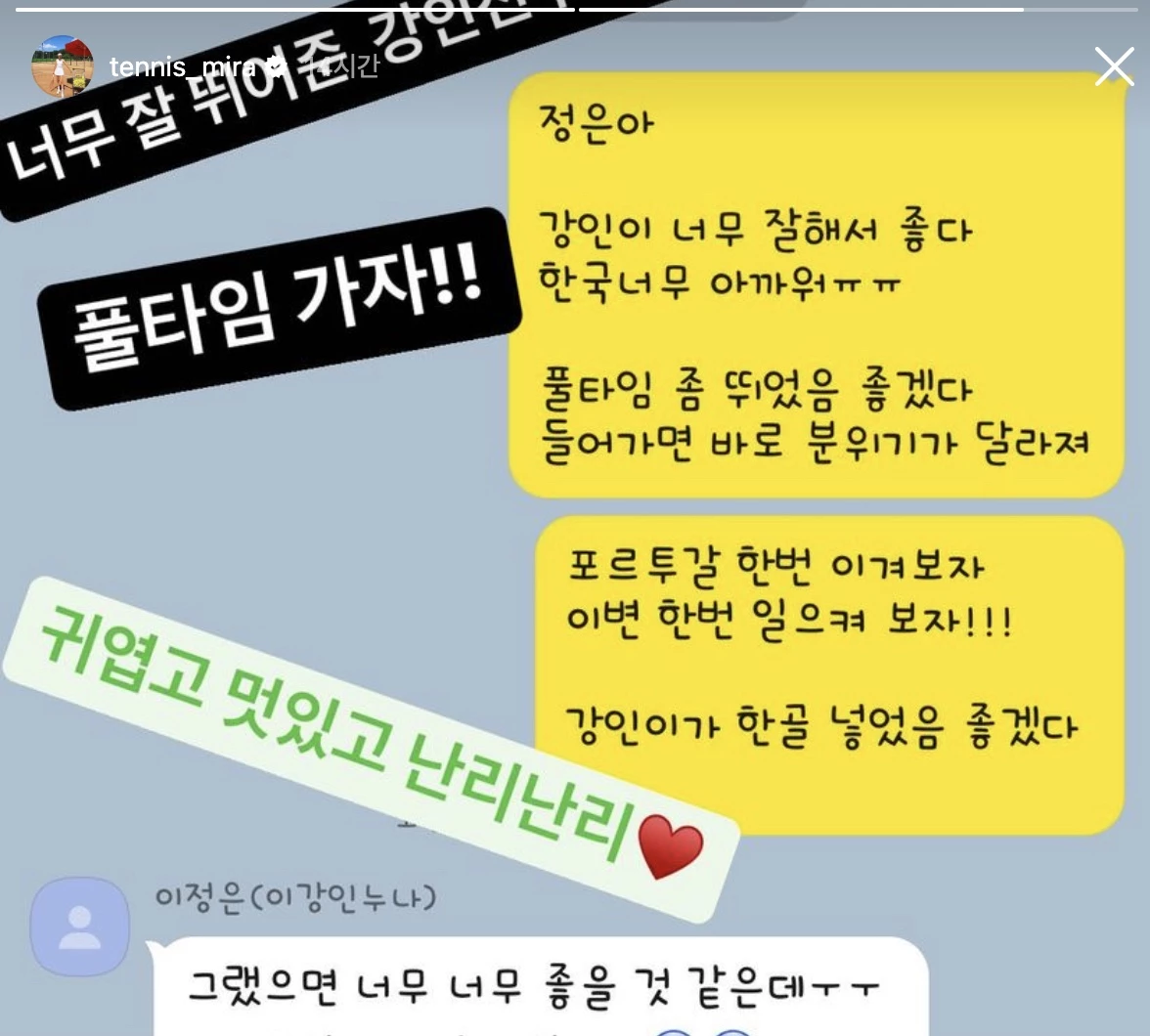 이강인의 누나도 전미라의 응원을 받았다. "강인이 너무 잘해서 좋다. 풀타임 뛰었으면 좋겠다. 포르투갈 한번 이겨보자. 강인이가 한 골 넣었으면 좋겠다"라는 메시지에 이강인의 누나 이정은 씨는 "그랬으면 너무 너무 좋을 것 같은데"로 시작하는 말로 떨리는 심경을 전하기도 했다.
