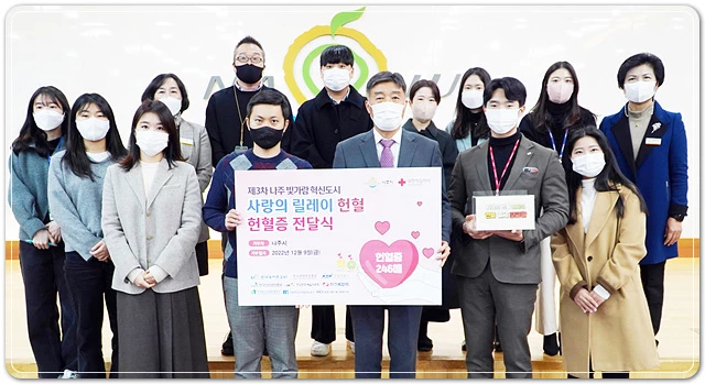 전남 나주시(시장 윤병태)는 대한적십자사 광주전남혈액원 주관 ‘빛가람 혁신도시 사랑의 릴레이 헌혈 캠페인’에 참여한 9개 공공기관 임직원들이 헌혈증 253매를 기탁해왔다고 9일 밝혔다.