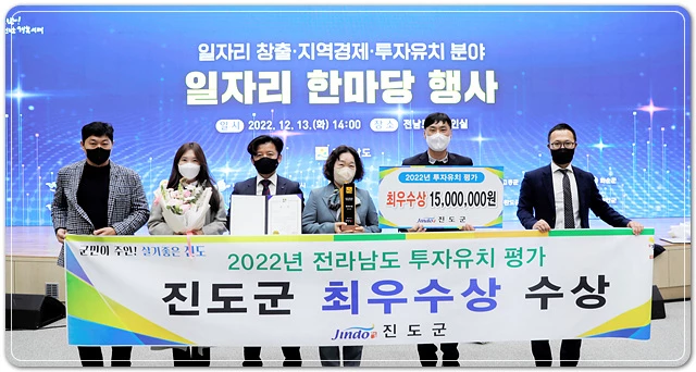전남 진도군이 전라남도 주관, 2022 전남 일자리 한마당 행사에서 투자유치 평가 최우수상 등 2개 분야 우수 시·군으로 선정됐다.