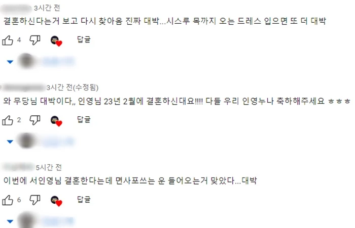 누리꾼들은 1년 전 영상임에도 "서인영 씨 결혼 기사 보고 다시 들어왔다", "소름", "성지순례", "진짜 맞히셨다" 등 댓글을 달며 놀랍다는 반응을 보였다.