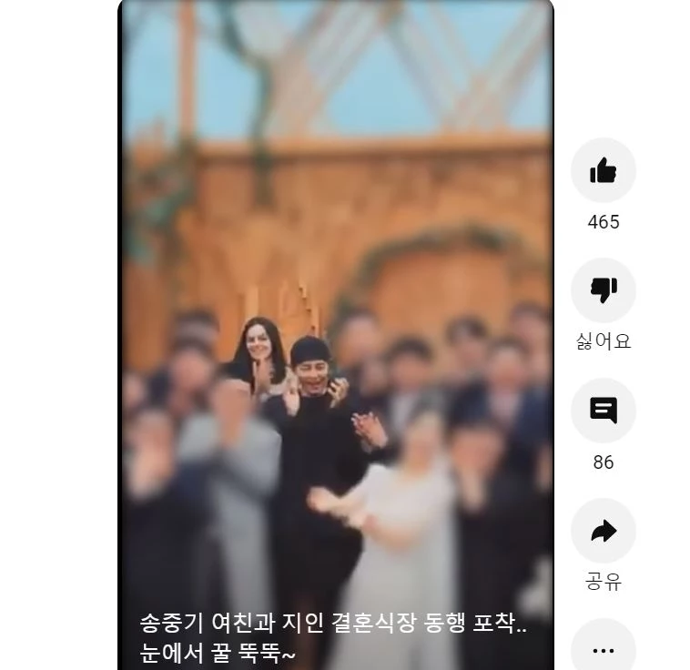 영상 속 송중기와 그의 연인은 결혼식장에서 함께 사진을 찍고 있다. 송중기는 신부와 친한 사이인 듯, 포옹하고 다정한 대화를 나눴다.