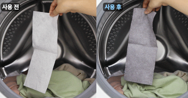 사용법은 간단하다. 평소 세탁할 때랑 똑같이 세제와 섬유유연제를 넣고 빨래 속에 티슈를 넣은 뒤 돌려주면 된다. (옅은 색 의류 1~2장, 중간색 의류 2~3장, 진한 색 의류 3장 이상)