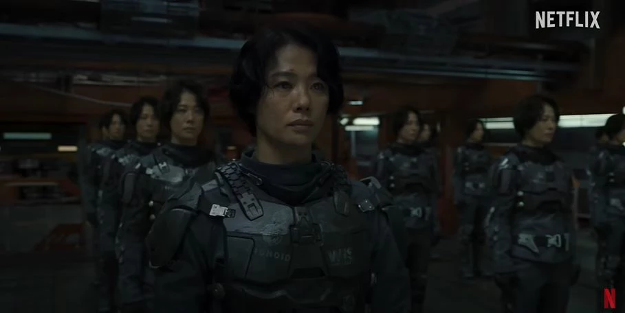 ‘정이’는 기후 변화로 더는 지구에서 살 수 없게 된 인류가 만든 피난처에서 전쟁이 일어나자 용병 ‘정이’의 뇌를 복제해 전투 AI를 개발하면서 벌어지는 이야기로 ‘부산행’, ‘지옥’을 연출한 연상호 감독의 신작이다.