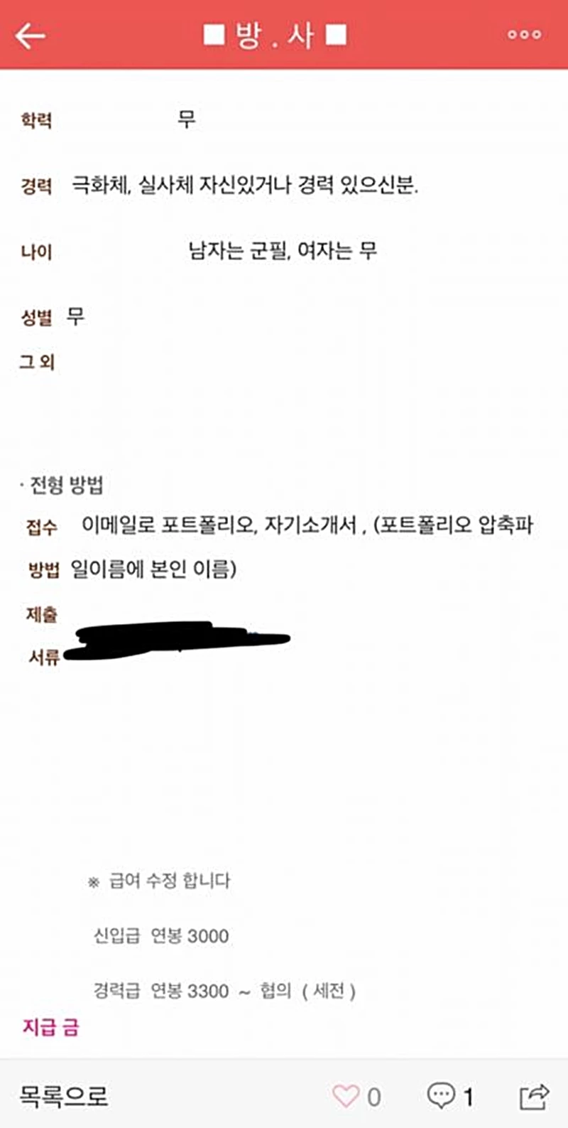 다음은 기안84 회사 채용공고다. 2019년 내용이다.