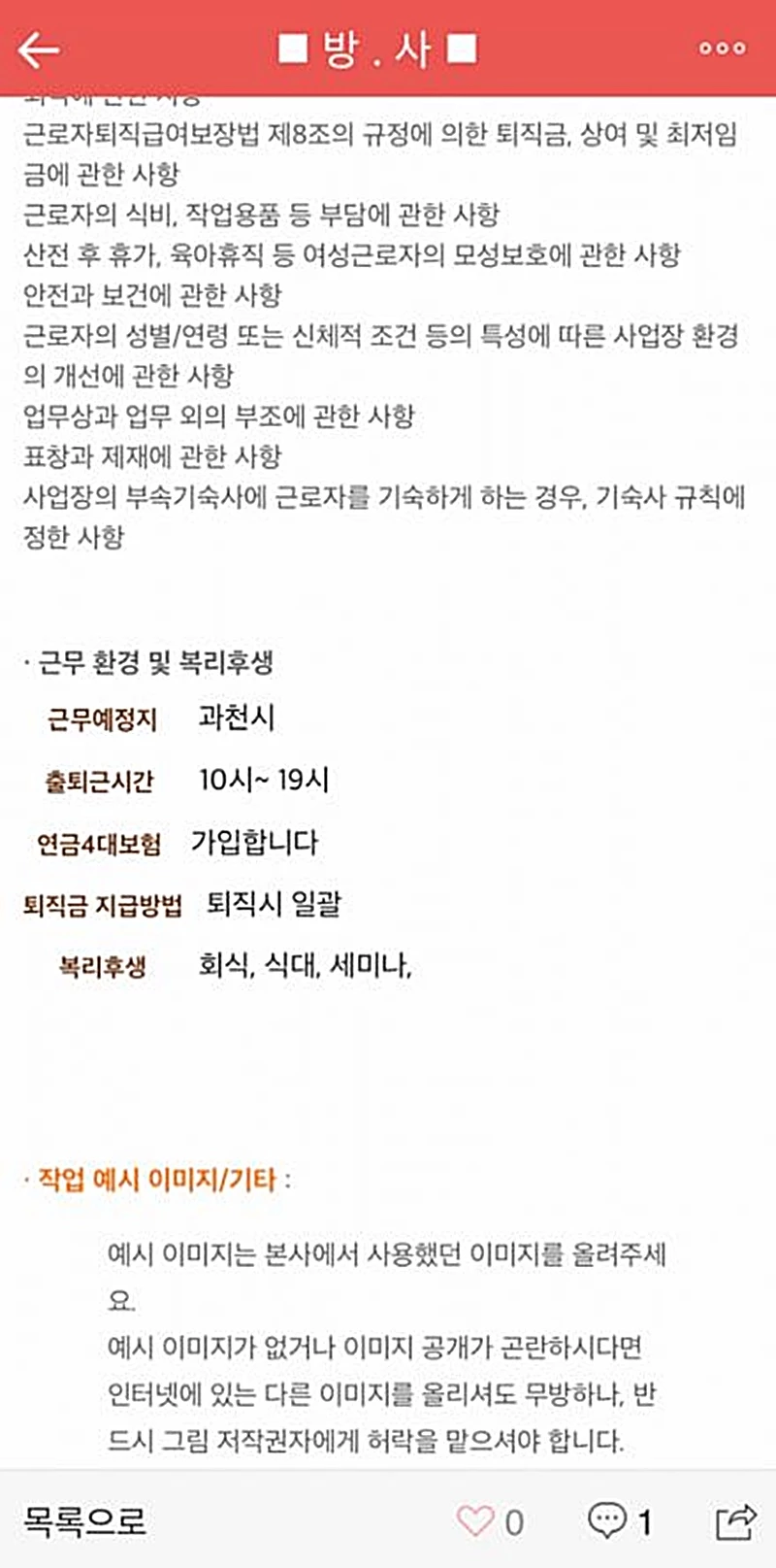 이 내용을 공유한 더쿠 네티즌은 "2019년에 올라온 글(채용공고)이다. 근무 시간은 오전 10시부터 오후 7시까지인데 (기안84가) 오후 9시라고 잘못 쓴 것이라고 한다. 어시스트는 박봉에 열정페이로 굴러가는 업계에서 당시 대우가 좋다는 반응이 나왔다"라고 말했다.