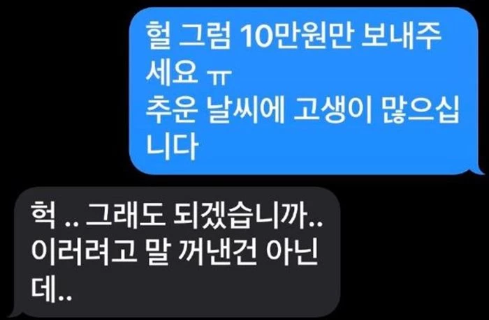 군인이라는 소리에 A씨는 "그럼 10만 원만 보내 달라. 추운 날씨에 고생이 많다"며 가격을 깎아줬다. A씨는 애초 13만 원에 판매 물건을 올렸다.