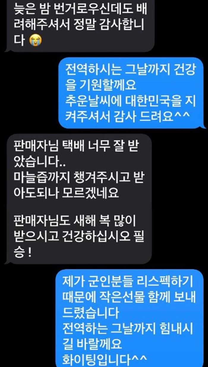 A씨는 "내가 군인들을 존경하기 때문에 작은 선물을 함께 보냈다. 전역하는 그날까지 힘내길 바란다"고 답했다.