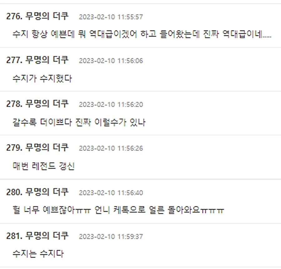 이를 접한 네티즌들은 "제가 대신 가면 안 되나요", "수지 언니는 내 인생의 축복", "오늘부터 제 이름은 게스입니다", "수지는 너무 지나치다. 너무 예쁘다", "오늘 하루도 얼굴 열일에 감사합니다", "비주얼은 여자 연예인 중에 원톱", "만화 캐릭터 같다", "말이 되나…", "'오바' 하면서 들어왔는데 바로 수긍함", "수지가 수지했다", "'수지 항상 예쁜데 뭐 역대급이겠어' 하고 들어왔는데 진짜 역대급이네…", "요즘 살 엄청 빠진 것 같았는데 진짜 많이 빠졌네. 빠질 게 뭐가 있다고ㅠㅠ"라며 감탄했다.