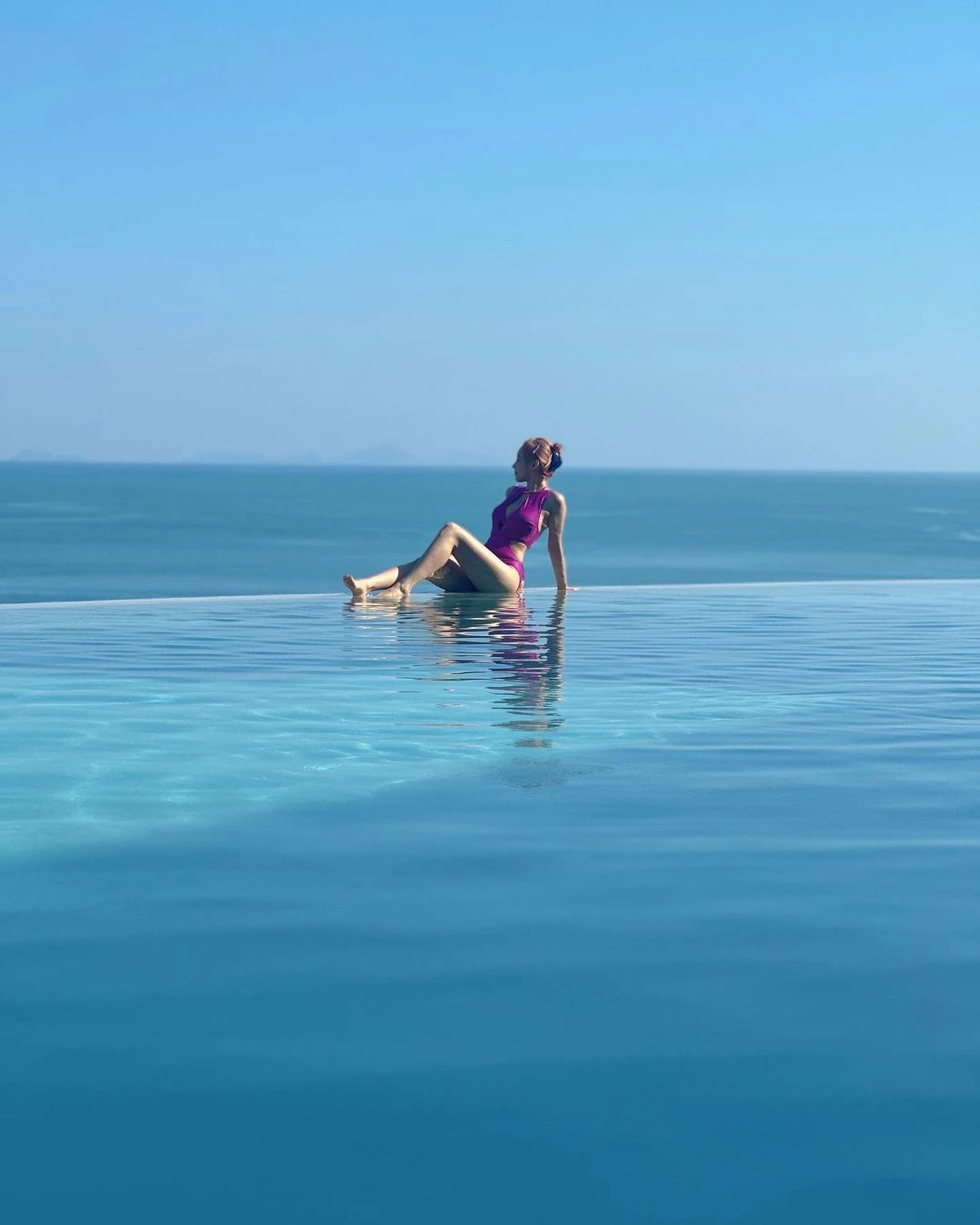 사진 속 태국을 방문한 성소는 바다와 섬이 한눈에 보이는 수영장에서 과감한 포즈를 취하고 있다.