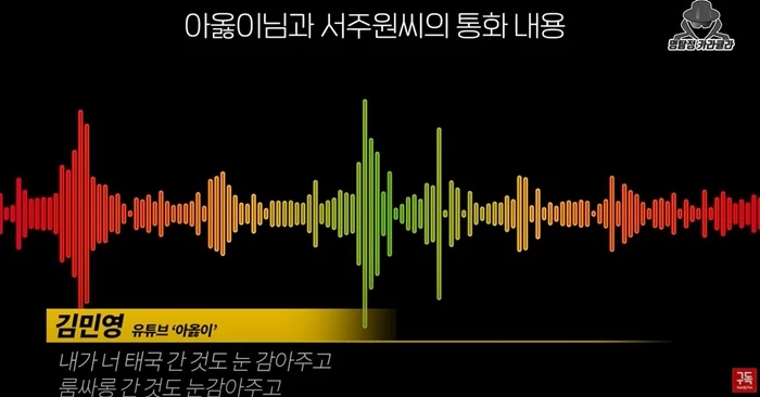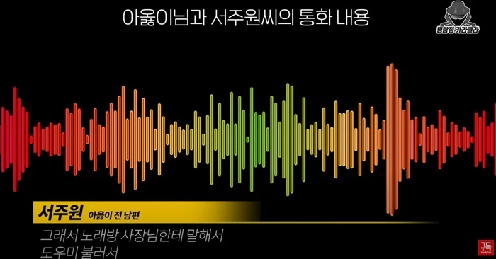 카라큘라가 공개한 아옳이, 서주원의 통화 녹취록에는 서주원이 회식을 하며 노래방 도우미를 부른 것, 룸살롱에 방문한 내용 등도 담겼다.