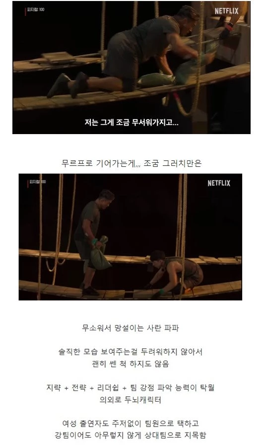 이어서 “그런데 매너 게임을 하면서도 쇼맨십도 있다. 또 미션에서 무섭고 잘 못하는 건 숨기지 않고, 지략과 리더십, 팀의 강점 등을 잘 파악한다. 여자여도 주저 없이 팀으로 뽑고 상대 팀으로 강한 쪽을 선택한다. 미션에서 상황 판단도 뛰어나고 후배들 장난도 잘 받아준다”고 호평했다.