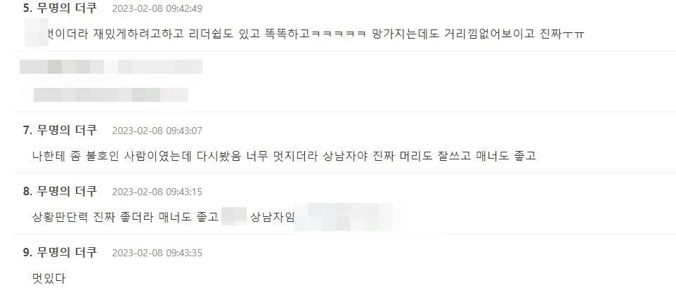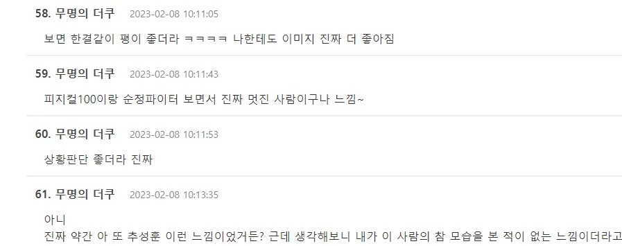 다른 네티즌들 역시 “진짜 보는데 멋있었다”, “재밌게 하려고 망가지는 것도 거리낌 없어 보였다”, “나한테는 호불호가 있었는데 다시 봤다”, “상황판단력 진짜 좋더라”, “진짜 또 추성훈 이런 느낌이었는데 내가 이 사람의 참모습을 본 적이 없었다”며 공감했다.