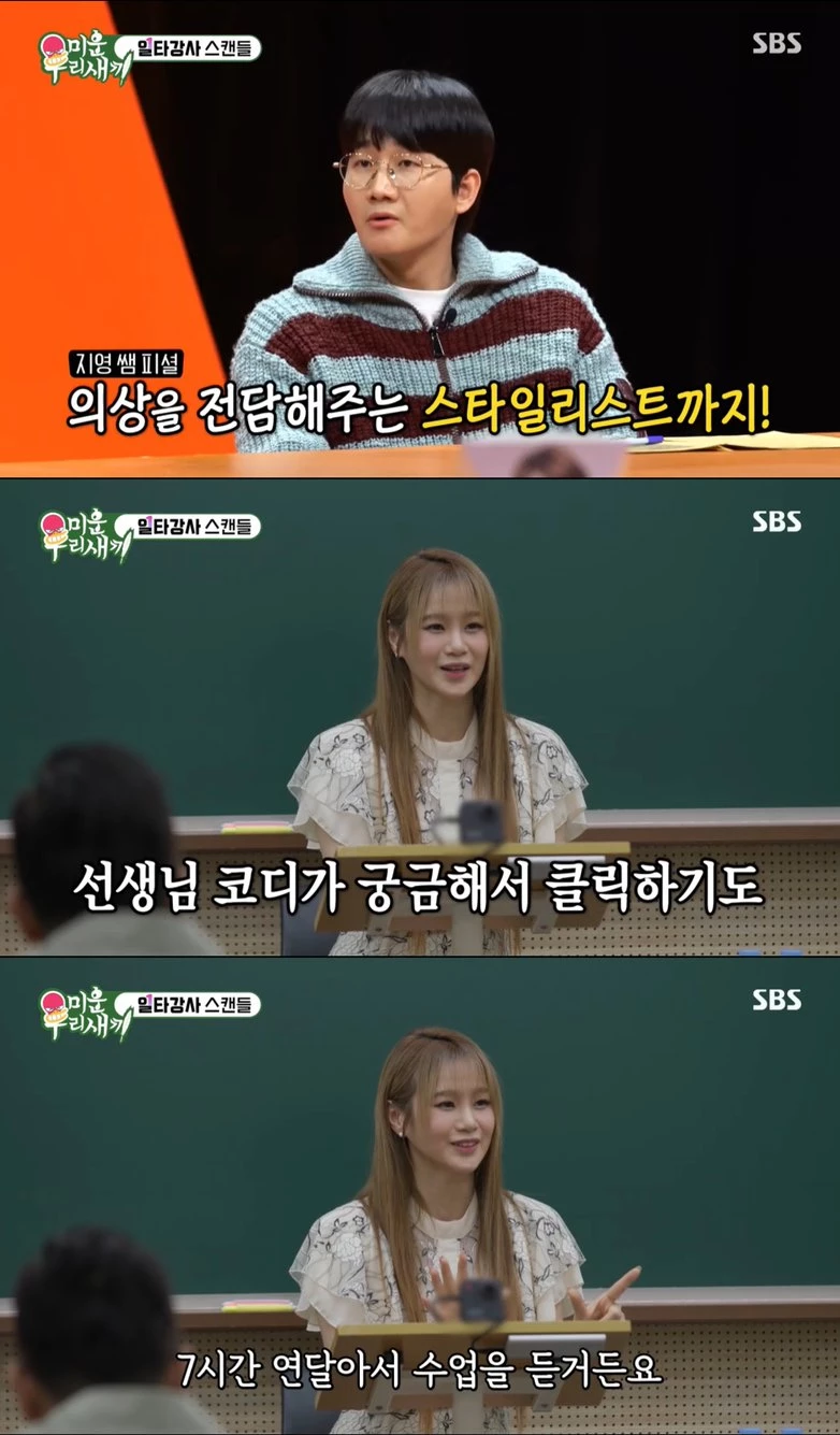 그는 "첫 수업은 오전 9시지만 오전 5시부터 헤어, 메이크업한다"면서 실제로 스타일리스트가 있다고 밝혀 모두를 놀라게 했다. 이지영은 "학생들 입장에서는 선생님이 헤어, 메이크업, 코디를 궁금해서 다음 강의를 클릭하기도 한다"고 설명했다.