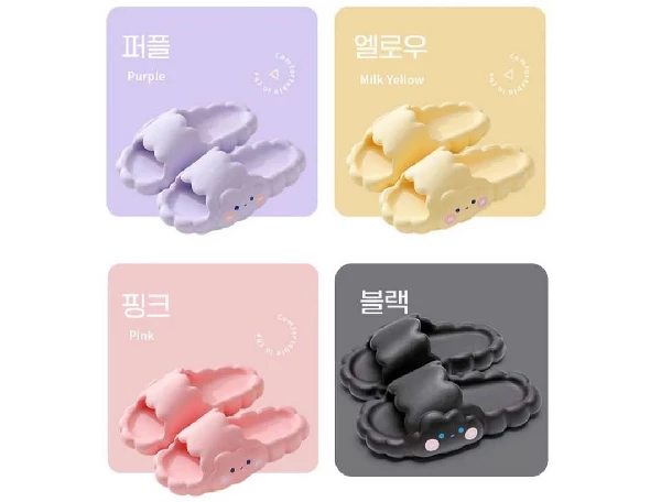 퍼플, 옐로우, 핑크, 블랙 총 4가지의 예쁜 컬러로 남녀노소 누구나 편하게 신을 수 있다. 디자임, 착화감, 가성비 모두 잡은 실내용 슬리퍼로 호응이 크다.