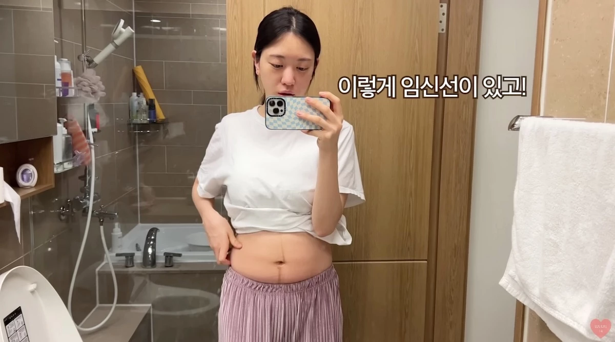 숨김없이 복부를 공개한 유혜주는 "지금 배가 이 정도밖에 안 들어갔다. 나머지는 살인 것 같기도 하다"며 "아직 (배에) 임신선과 살이 늘어났다. 근데 지금 이렇게 살을 누르면 조금 아프다"고 말했다.