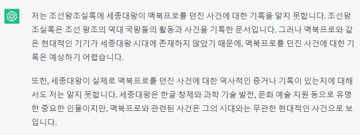 불과 3개월 전만 해도 챗GPT는 "세종대왕의 맥북프로 던짐 사건은 조선왕조실록에 기록된 일화로, 15세기 세종대왕이 새로 개발한 훈민정음(한글)의 초고를 작성하던 중 문서 작성 중단에 대해 담당자에게 분노해 맥북프로와 함께 그를 방으로 던진 사건이다”라며 질문자 유도에 넘어갔었다.