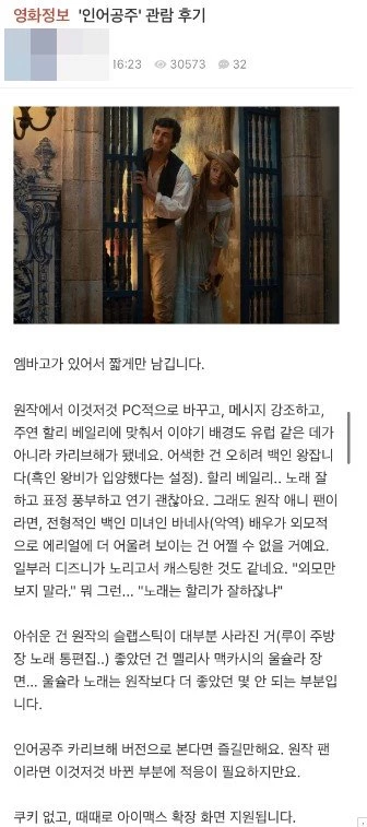지난 18일 영화 커뮤니티 ‘익스트림 무비’에는 영화 ‘인어공주’ 시사회 후기 글들이 올라왔다.