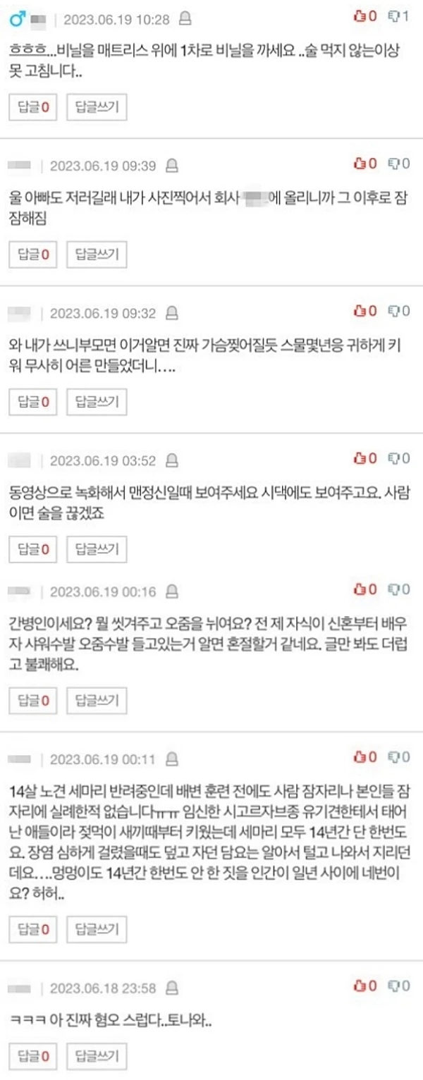 네티즌은 "일단 방수 매트라도 까세요... 술에 취해서 계속 실수하면 그만큼 취하지 않도록 노력해야죠", "시부모님과 부모님께 말하고 남편 술 끊게 하세요", "동영상 촬영했다가 맨정신일 때 보여 줘요. 사람이면 술을 끊겠죠", "금주 외엔 답 없습니다", "간병인도 아니고... 자식이 신혼부터 배우자 오줌 수발드는 거 알면 (부모님이) 혼절할 거 같네요", "오줌쌀 때마다 남편 돈으로 침대를 바꾸세요. 몸소 와닿는 게 있어야 안 싸든 기저귀를 차든 하겠죠", "그냥 빨리 도망가세요", "나라면 바로 이혼이다. 이건 사람이 아니라 개랑 결혼한 거 아니냐"라는 반응을 보였다.