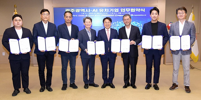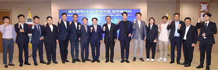 강기정 광주광역시장이 28일 오후 시청 3층 비즈니스룸에서 인공지능 산업생태계 조성을 위한 ‘광주광역시-인공지능 유치기업 업무협약식’을 갖고 협약서 서명 후 기념촬영을 하고 있다. / 광주광역시 제공