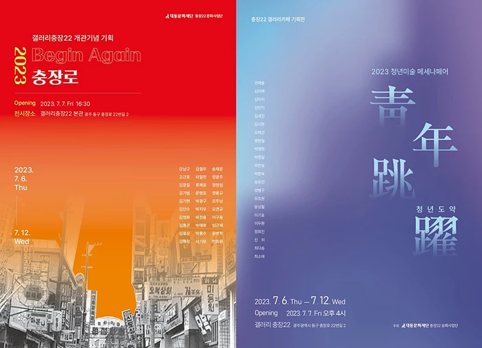 이번 행사는 7일 개막을 시작으로 오는 12일까지 마련하는 ‘갤러리 충장22’ 개관 기념 기획전으로, ‘2023 비긴어게인 충장로’와 청년미술 메세나 페어 ‘청년도약’이 동시에 진행된다.