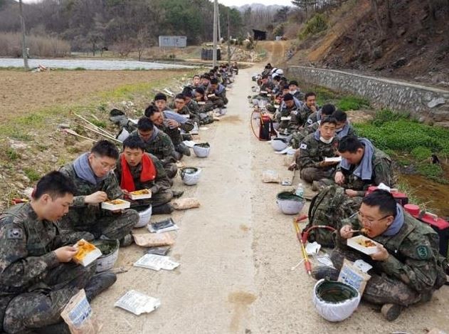 일부 장병은 배가 고픈 듯 미처 모자를 벗지 못하거나 짐도 내려두지 못한 채 식사에 집중하고 있다.