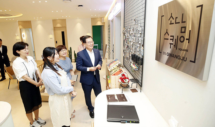 27일 문인 광주시 북구청장이 청년 소상공인 라이브커머스 지원사업이 진행되고 있는 광주 소담스퀘어를 방문해 소상공인들이 만든 제품을 관람하고 격려하고 있다. 라이브 커머스는 실시간 동영상 방송으로 상품을 판매하는 것으로 홈쇼핑과 비슷한 성격을 띄고 있다.